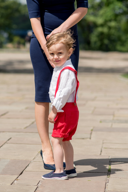Благородный синий цвет в фаворе у монарших особ. Принц Джордж неоднократно появляется на публике в синих шортах, футболках-поло, комбинезонах и кардиганах.