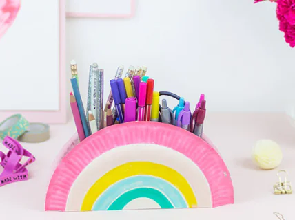 Теперь вы знаете как сделать подставку для канцтоваров из бумажной тарелки в виде радуги своими руками.