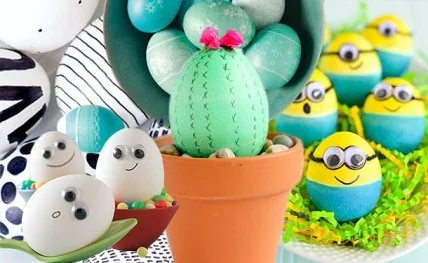 Пасхальные яйца в виде Миьонов порадуют фанатов этих забавных персонажей. Для такого декора вам понадобится пищевая краска для яиц голубого и желтого цветов, подвижные глазки, черная нить, клей и маркер.