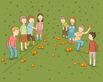 Правила игры: рисуются две линии на расстоянии 10–15 м друг от друга, за которыми размещаются команды. На линии в ряд перед игроками обеих команд кладутся горкой апельсины: снизу кладут три, сверху — еще один. Команды попеременно бросают апельсинами по горкам противника. Если удалось ее рассыпать, то попавший забирает апельсины для своей команды.