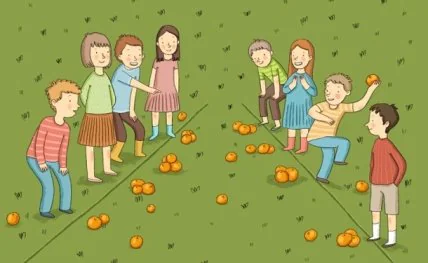 Правила игры: рисуются две линии на расстоянии 10–15 м друг от друга, за которыми размещаются команды. На линии в ряд перед игроками обеих команд кладутся горкой апельсины: снизу кладут три, сверху — еще один. Команды попеременно бросают апельсинами по горкам противника. Если удалось ее рассыпать, то попавший забирает апельсины для своей команды.