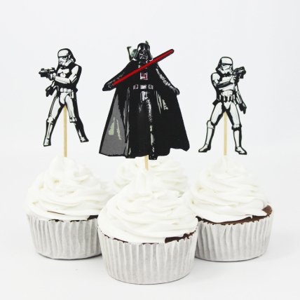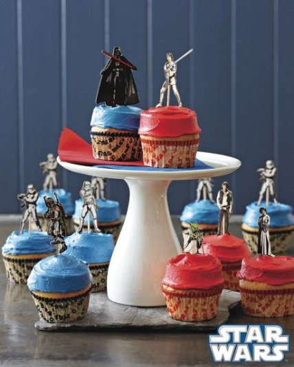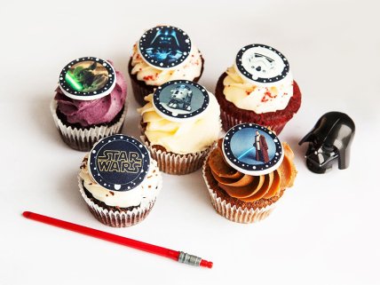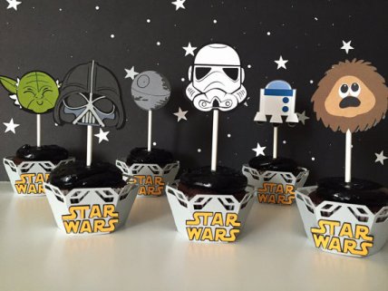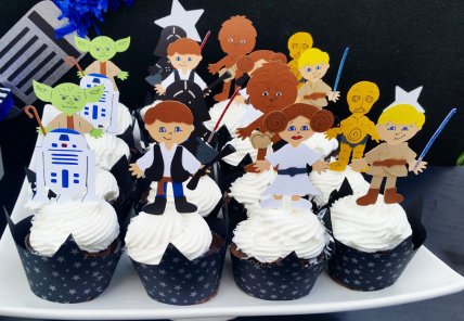 Если вы планируете угощать гостей капкейками, не обязательно выпекать или заказывать их в форме персонажей из «Звездных войн». Можно распечатать картинки, прикрепить их к зубочисткам и таким образом украсить ими сладости.