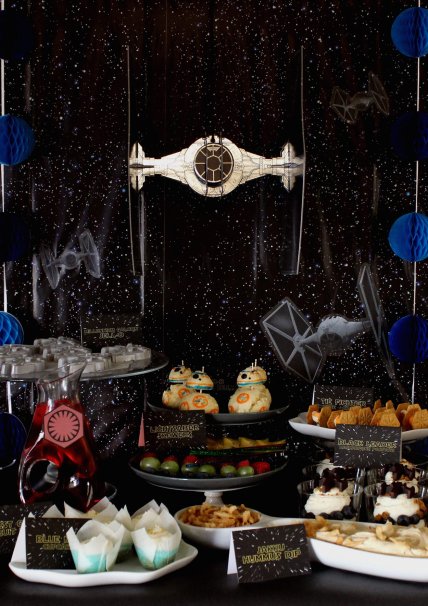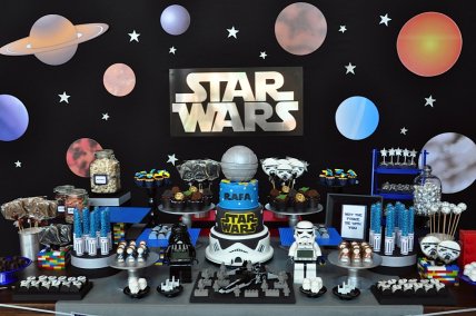 Все сладости и торт можете поместить на один стол, тем самым организовав кенди-бар для детей в стиле «Звездных войн». Стол покройте темной скатертью, а посуду для сервировки используйте синюю или серебристую, чтобы воссоздать просторы галактики. Не забывайте и про украшение стены за кенди-баром.