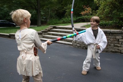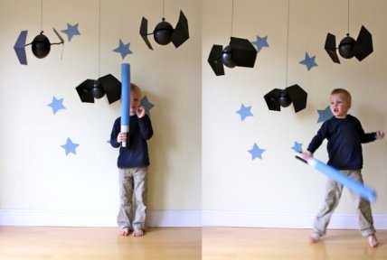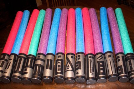 Ну и какой день рождения джедая без световых мечей? Такие световые мечи можно сделать из разноцветных поролоновых палок для бассейна и клейкой ленты. И конечно же, не забудьте устроить поединки на мечах.