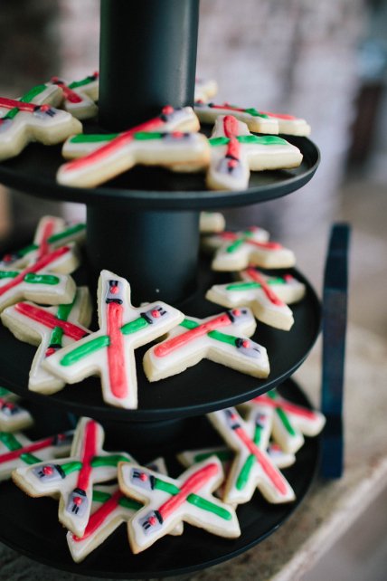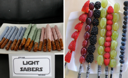 Угощения на тематическом празднике в стиле «Звездные войны» должны быть оформлены соответствующим образом. Используйте ярлычки и карточки, чтобы интересно подписать сладости для детей. Печенье, попкорн, сендвичи, бутерброды, пицца, фрукты будут как нельзя кстати на детской вечеринке.