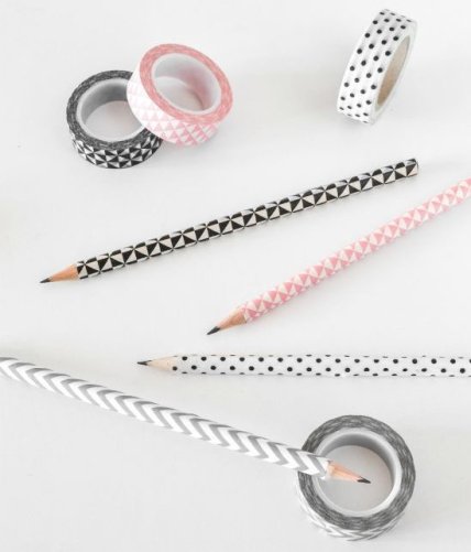 Наверное, самый простой и от того не менее эффектный способ, как украсить ручки или карандаши, является декор при помощи декоративной клейкой ленты. Цвета, узоры, их сочетания могут быть какими угодно. Просто обклейте каждый карандаш клейкой лентой разных цветов и наслаждайтесь разнообразием в своем пенале, который также легко сделать своими руками. По ссылке смотрите мастер-класс, как сделать школьный пенал своими руками.