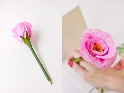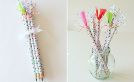 Что может быть милее, чем карандаш или ручка с вечноцветущим цветком? Фишка такого декора, конечно же, в цветке из бумаги, который следует сделать заранее и прикрепить к карандашу скотчем. Сам карандаш можно обмотать бумагой зеленого цвета, чтобы создать веточку.