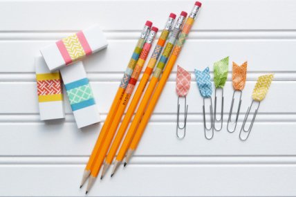 Чтобы украсить свои школьные скрепки и зажимы можно использовать яркую декоративную клейкую ленту. К тому же, для такого декора школьных принадлежностей понадобится совсем мало материала, а радовать глаз эта школьная мелочевка будет еще долго.