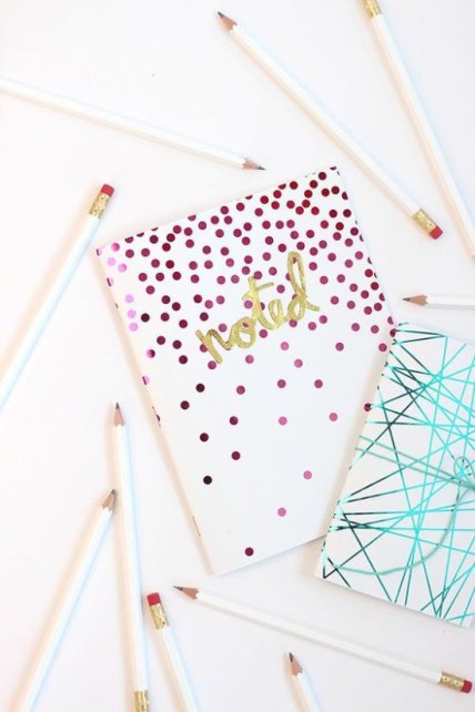 Декоративная клейкая лента также отлично подойдет для декора школьных тетрадей, папок, обложек книг и альбомов. Тонкие полосочки ленты можно клеить прямо или по диагонали, создавая свой особый паттерн.