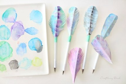 Кстати, перья к таким ручкам можно сделать из бумаги, раскрасив ее в красивые акварельные узоры. Тогда они будут даже на бумаге передавать всю легкость и невесомость настоящих.
