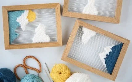 Шаг 7: Кусочек неба можно сделать таким же треугольным способом, как вы делали гору, только выбрав более светлый цвет нити. Добавьте облачко, а под ним снова при помощи ткачества сделайте солнышко.