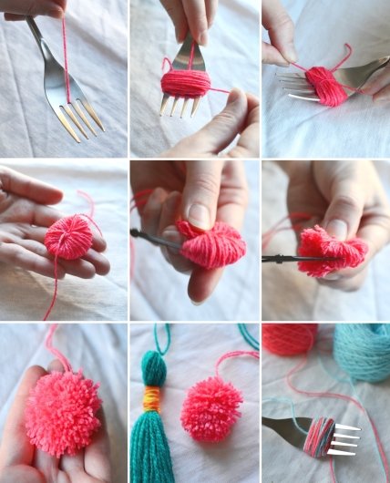 4. Теперь займитесь мини помпонами. Возьмите вилку и пропустите пряжу, длиной около 25 см, между средних зубцов. Кончики нити можно приклеить к вилке скотчем, чтобы они вам не мешали.