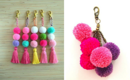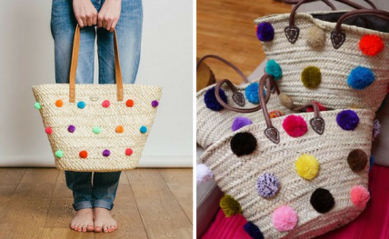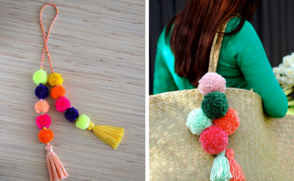 Если же вас не прельщает идея украсить помпонами всю сумку, сделайте небольшое украшение-кисточку и повесьте на ручку сумки — перебора нет, яркий акцент есть.