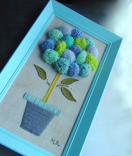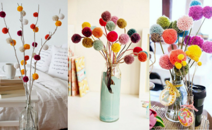 Наверное, самая крутая идея поделки из помпонов — декоративные «цветы». Нанижите разноцветные помпоны на обмотанные нитками кусочки проволоки или же деревянные веточки и поставьте в вазу. Такой букет способен удивить даже самых искушенных флористов.