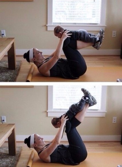 А это упражнение с ребенком на руках – настоящие качели для него. Лягте на спину, ноги согните в коленях и приподнимите на 90 градусов. Кроху положите на голени. И поднимайте ноги.
