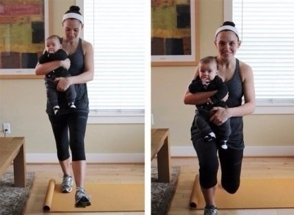Укрепить мышцы ног и таза помогут выпады. Возьмите ребенка на руки спиной к себе. Делайте выпады правой и левой ногой поочередно.