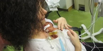 Целый месяц я не имела возможности держать ребенка на руках, а наш первый сеанс по «методу кенгуру» (когда ребенка кладут на грудь матери, «кожа к коже») продолжался считанные минуты, пока индикаторы состояния моей дочери не начали сигналить и мигать, указывая на кислородную десатурацию и резкое повышение давления.