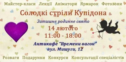 14 февраля, в День святого Валентина, общественная организация «Дар буття» приглашает всех желающих на теплый семейный праздник «Сладкие стрелы Купидона». Этот праздник любви - настоящая сладкая сказка для всех, кто влюблен в жизнь. Посетив праздник, вы попадете в волшебную, гостеприимную атмосферу, наполненную сладостями, огоньками любви и детским смехом.