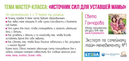 Ведущий отечественный эксперт по семейному тайм-менеджменту, бизнес-тренер и коуч Света Гончарова проведет серию открытых мастер-классов, где раскроет секрет безграничного источника сил!