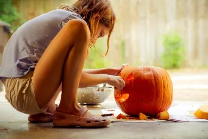 Лайфхак! Когда ребенок планирует участвовать в вырезании тыквы, предложите ему вычищать середину тыквы с помощью специальной ложки для мороженого, так ему будет проще.