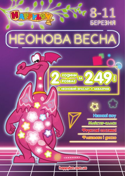 Приглашаем встретить весну в Хэппилоне. Празднуем 4 дня! Вас ждёт: яркая неоновая шоу-программа, сюрпризы, бесплатная фотозона, акционное предложение на развлечения!
