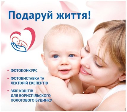 - благодійний збір коштів на придбання пульсоксиметру, який дозволяє почути серцебиття та визначити наявність гіпоксії крові у немовлят, та коагулятору з гінекологічними насадками для зупинки кровотечі у породіль. Ці прилади будуть допомагати Бориспільському Пологовому будинку рятувати життя дітей та їх матусь. Кожна гривня може допомогти лікарні, в якій щороку народжується не менше 3000 родин!