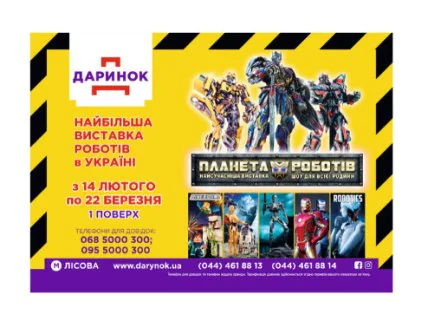 З 14 лютого по 22 березня включно на території маркет моллу «Даринок» працюватиме унікальна та найбільша в Україні виставка «Планета Роботів». Це інтерактивна виставка сучасних роботів та трансформерів із металу в повну величину, якими можна грати й керувати.