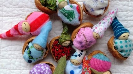 Девочки любят кукол, и особенно тех, которые сделала мама. Дочка будет с удовольствием играть с симпатичными малышами, спящими в кроватках из грецких орехов, даже если она привыкла к современным пупсам с гардеробом и мебелью. Кроме того, она с радостью присоединится и поможет создать таких забавных куколок. Попробуйте сделать их вместе!