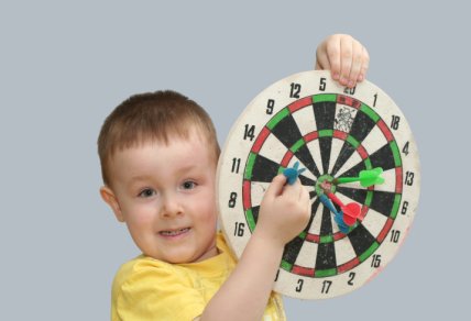 Игроки метают дротики в мишень, завязав перед этим глаза. Если нет готовой мишени, ее можно сделать самостоятельно, нарисовав на большом листе ватмана. Важно не забыть указать на ней количество очков. Ведь в этой игре выигрывает тот, кто наберет больше очков, играя в дартс с закрытыми глазами.