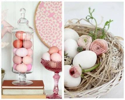 Для пасхального декора обычно используют цветы, ветки деревьев, фигурки пасхальных кроликов, цыплят, выдутые яйца.