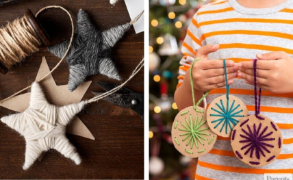 Если в семье кроме малыша есть старший ребенок, который горит желанием смастерить своими руками игрушку на елку, предложите ему такие варианты: обмотать звездочку из плотного картона нитками. Или "вышить" снежинку на плотном картоне. Правда вам придется предварительно пробить дырочки, в которые нужно будет продевать нитки.