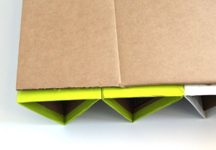 Соедините модули между собой прочным двусторонним скотчем или клеевым пистолетом. Вырежьте два картонных прямоугольника по размеру верхней и нижней площадок вашей стойки для обуви, и наклейте их, чтобы сделать стойку более прочной.