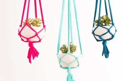 Техника узелкового плетения «макраме», и кашпо, сплетенные в этой технике, всегда были популярным решением для интерьера. Менялись только детали. Когда-то то в фаворе была толстая хлопковая нить и замысловатые узоры, сейчас популярны простые приемы плетения и яркие материалы для кашпо в технике макраме.
