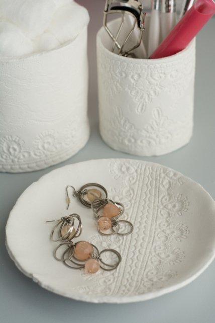 Чтобы украсить снежно-белые подставки из холодного фарфора для разных косметических мелочей, возьмите кусочки кружевной ленты, прижмите их на только что раскатанный пласт фарфора и через какое-то время аккуратно снимите. И помните, изделия из холодного фарфора получаются белыми, если их не сушить в духовке.