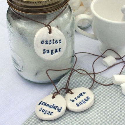 Держать все контейнеры с крупами под контролем и никогда не путать, где и что лежит, помогут вот такие значки, сделанные из холодного фарфора и нанизанные на шнурочек. Надписи легко сделать острой палочкой по еще мягкому фарфору.