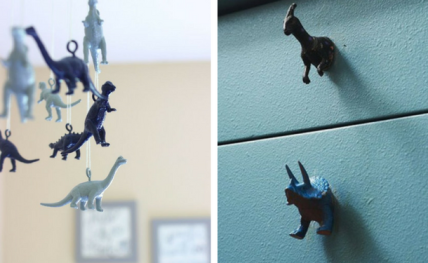 Мы уже делились идеями для повторного использования ненужных пластиковых игрушек. Используйте их при декорировании детской комнаты. Пластиковые динозавры легко превратить в детский мобиль, ручки для ящиков стола, цветочный вазон из пластиковых игрушек, вешалку, подставку для книг или держатель для фото. Также динозавры могут стать отличным декором для флорариума или настенного зеркала.