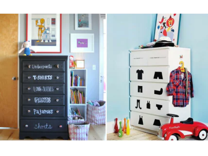 Если клеить или рисовать непосредственно на ящиках шкафа вам не хочется, оформите лишь ручки комода. Привяжите к каждому выдвижному ящику бирку с изображением вещи или наклейте картинку на ручку. При надобности, изображения с ящиков, где хранятся вещи ребенка, всегда можно поменять. А еще интереснее, если сделать сами ручки в форме вещей.