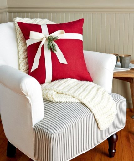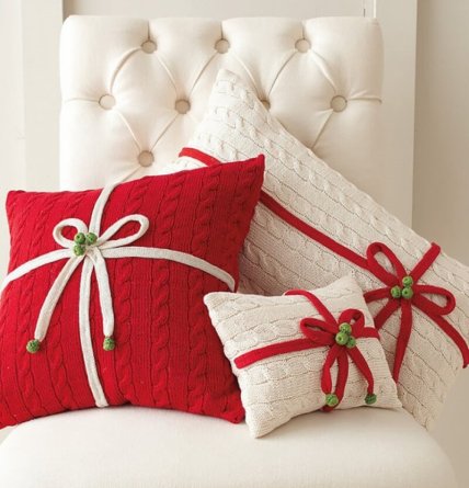 Подушки из старых вязаных свитеров очень легко оформить в виде новогоднего подарка. Как, впрочем, и любую другую подушку. Нужно всего лишь перевязать подушку декоративной лентой, чтобы получилась а-ля упаковка подарка.