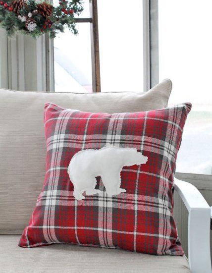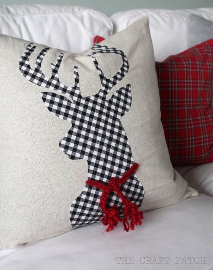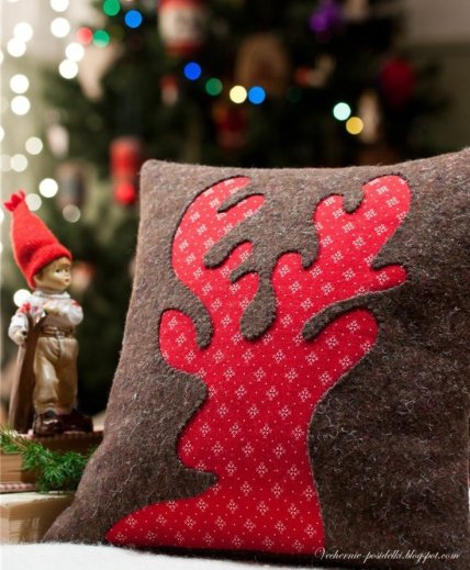 Подушки с силуэтами животных, особенно с силуэтом оленя Рудольфа, выглядят очень по-зимнему. Вам потребуется распечатать на принтере картинку оленя или другого животного и вырезать по контуру. По шаблону вырежьте силуэт из любой ткани, соедините с клеевым флизелином и приутюжьте его к подушке.