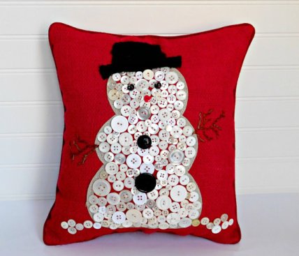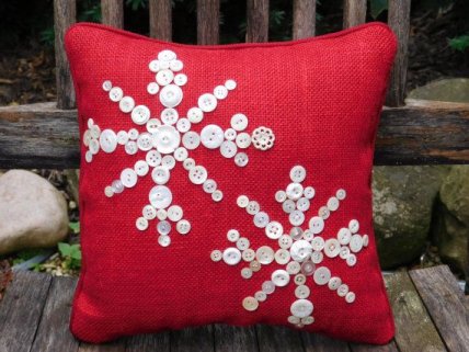 Если вы любите варианты посложнее, новогодняя подушка, украшенная пуговицами — именно то, что вам надо. Впрочем, сложность здесь заключается не в том, как сделать саму подушку, а в том, что вам понадобится много времени, чтобы пришить все пуговицы в виде рисунка.