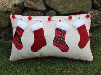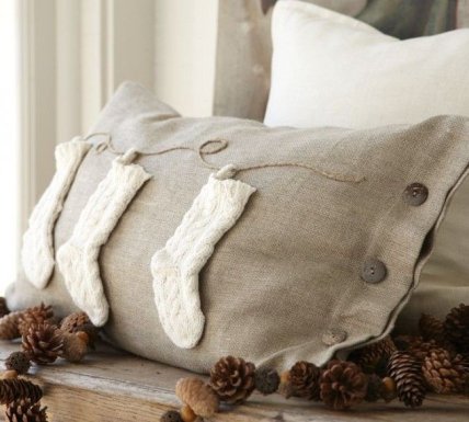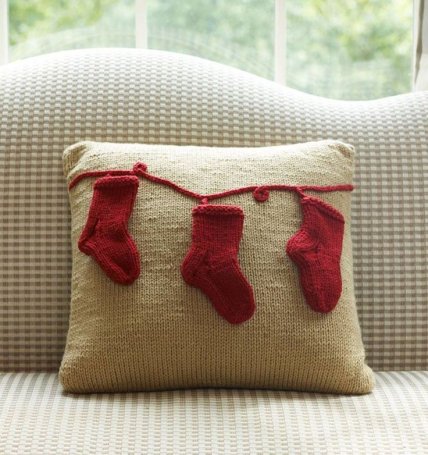 Новогодние подушки также можно украсить мини-рождественскими носками. Это могут быть вязаные носки или вырезанные из ткани и наклеенные на подушку. Оригинальный и просто вариант — взять несколько одинаковых детских носочков и пришить их к подушке.