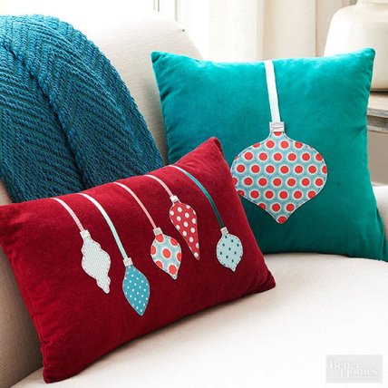 Аппликации — самый простой способ украсить обычную подушку, тем самым превратив ее в праздничную. Ткань и фигуры могут быть самыми разными: елки, снежинки, елочные игрушки, снеговики и прочее. Позвольте детям выложить фигурки как им хочется, а уже потом пристрочите (если имеется швейная машинка) или приутюжьте (если используете флизелин) детали аппликации к подушке.