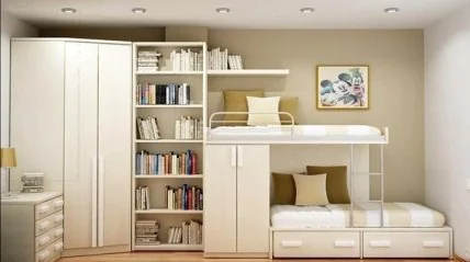 - У каждого из детей должно быть свое личное пространство. Своя кровать, свой шкаф, свое рабочее место. Если не удается поставить два шкафа, разделите полки поровну, чтобы ни один из малышей не остался обделенным.