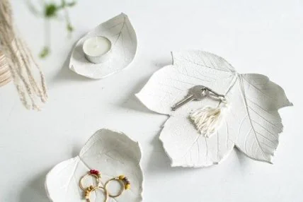 Немного осенних листьев в интерьере никогда не помешает. Там более, что эти листья — вполне функциональны, и могут служить вазочками для мелочей и бижутерии, подставкой под чашки или даже подсвечником. Правда, для этого осенние листья придется сделать собственноручно из самозастывающей глины. Попробуйте: получится очень эффектно.