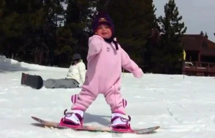 Когда девочке исполнился годик, спортивные родители поставили ее на сноуборд. И что самое удивительное – у девочки получается спускаться на нем и даже держать равновесие! А ведь в годик детки только-только начинают самостоятельно ходить.
