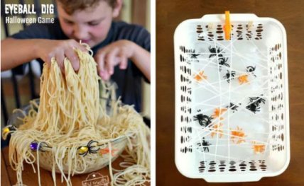 Для совсем маленьких можно устроить сенсорную коробку из круп, макарон, и положить туда паучков, небольшие игрушечные тыковки, фасолины, разрисованные в виде глаз. Пусть ребенок собирает "сокровища". Также один из вариантов - натянуть нити сквозь отверстия в коробке, а на дно положить конфеты, паучков и все, что вздумается. Задача ребенка - достать со дна предметы, стараясь не касаться нитей.