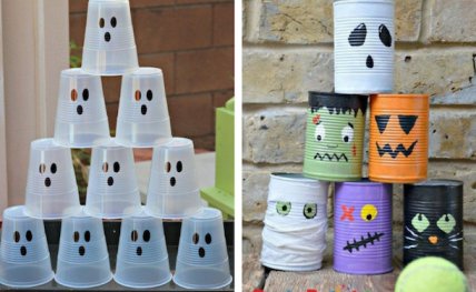 Эта игра чем-то напоминает игру в "Городки". Но вместо деревянных полочек и конструкции из них, можно использовать почти все, что найдется под рукой: баночки от десткого питания, ппакеты из-под сока, рулоны туалетной бумаги и пластиковые стаканчики. Главное - придать реквизиту "хэллоуиновский" антураж. В качестве "орудия" можно использовать свертки из бумаги или мешочек с крупой или песком внутри, который тоже можно оформить в виде тыквы.
