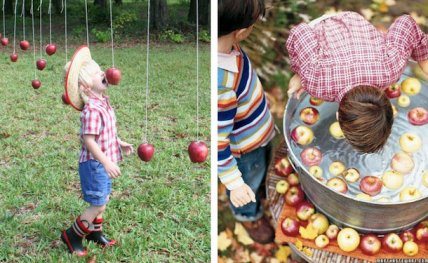 - Каждый из учасников по очереди за опрделенное время должен попытаться словить яблоко зубами, держа руки за спиной.