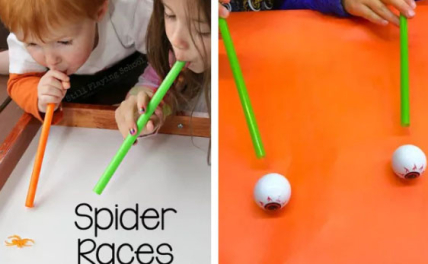 - Каждому ребенку дают коктейльную трубочку, через которую он должен дуть на своего паучка.