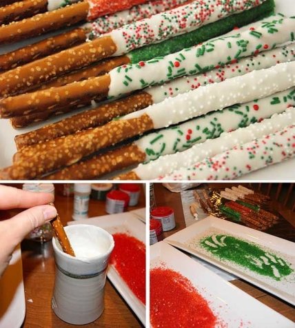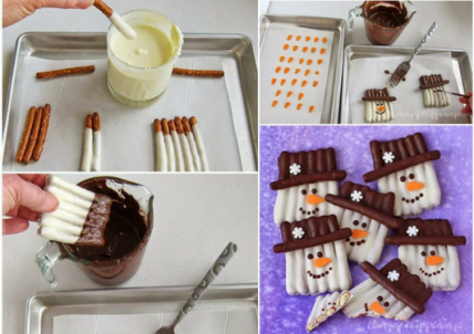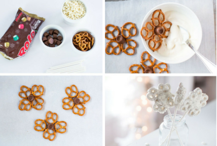 А из мини-крендельков (мини-брецелей) могут получится съедобные снежинки. Для этого соедините крендельки шоколадом посередине, обмакните в белый шоколад или растопленный зефир и оставьте на какое-то время застывать.